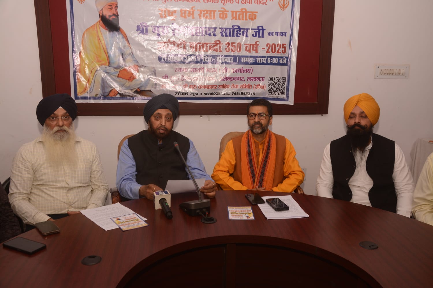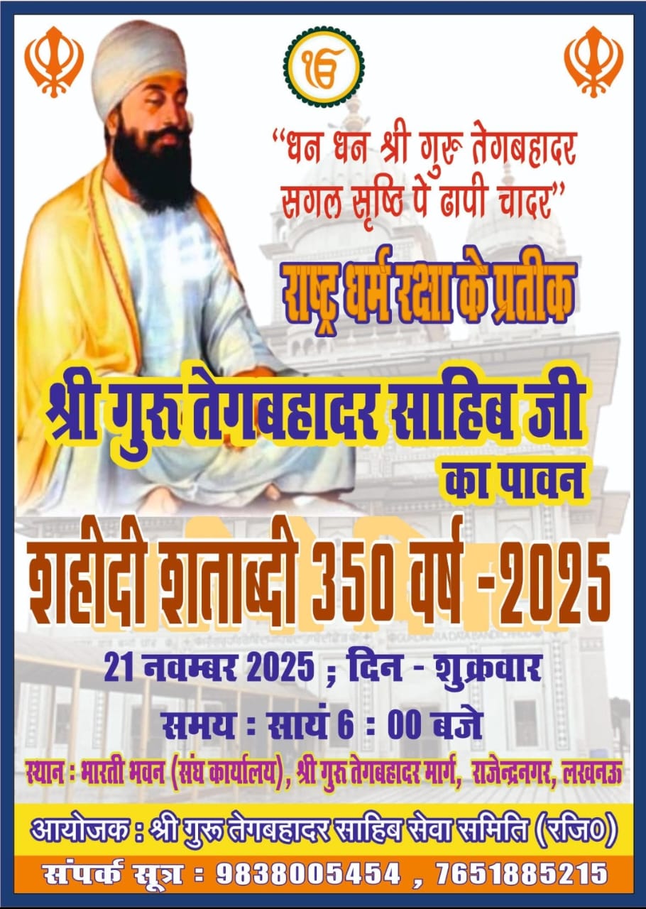श्री गुरु तेग बहादर साहिब जी महाराज का शहीदी शताब्दी 350 वर्ष 2025 दिनांक 21 नवंबर 2025, दिन शुक्रवार समय शाम 6 बजे स्थान-भारती भवन, संघ कार्यालय, श्री गुरु तेगबहादर मार्ग, राजेंद्र नगर, लखनऊ में श्री गुरु तेग बहादर साहिब सेवा समिति द्वारा बड़ी श्रद्धा एवं सत्कार के साथ मनाया जाएगा
