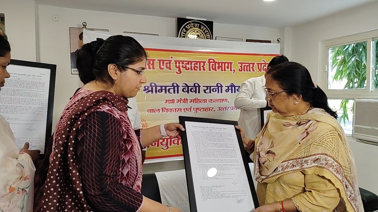 उत्तर प्रदेश सरकार द्वारा कर्मचारियों और उनके परिवारजनों के प्रति संवेदनशीलता का परिचय देते हुए महिला कल्याण, बाल विकास एवं पुष्टाहार विभाग की मा० मंत्री बेबी रानी मौर्य* ने अपने कर-कमलों से कुल *06* मृतक आश्रितों को अनुकम्पा नियुक्ति पत्र लखनऊ कैम्प कार्यालय में दिये।