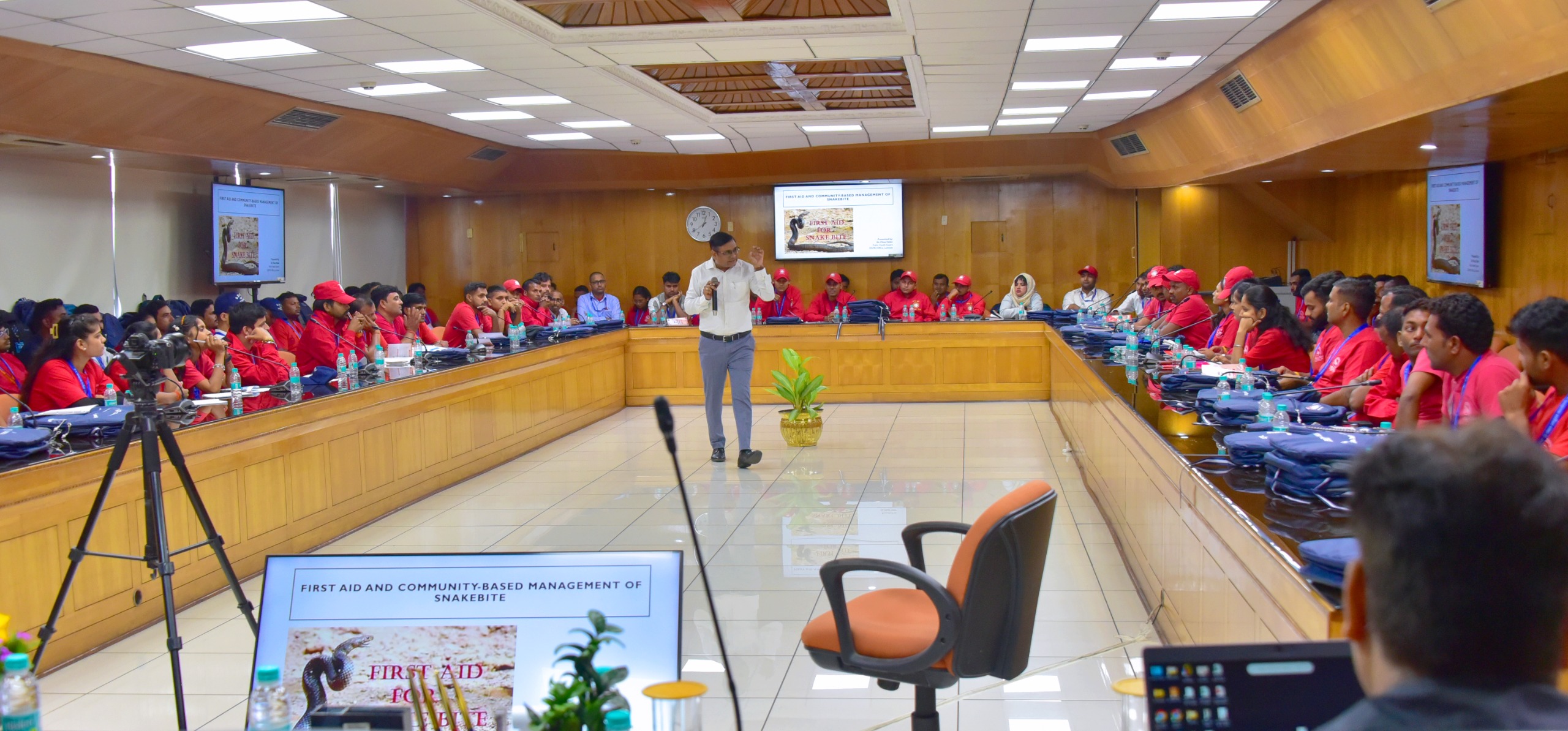 कार्यशाला में डॉ. विपिन वर्मा, डॉ. निशांत भारद्वाज, प्रो. शैफाली गौतम, डॉ. नीलकमल मिश्रा और डॉ. विकास यादव ने सर्पदंश की पहचान, प्राथमिक उपचार, सीपीआर प्रक्रिया एवं एम्बूबैग के सही उपयोग पर व्यावहारिक प्रशिक्षण दिया। प्रतिभागियों को यह बताया गया कि पीड़ित को शांत रखकर, प्रभावित अंग को हृदय से नीचे रखना और समय पर अस्पताल ले जाना ही जीवन रक्षक कदम हैं।