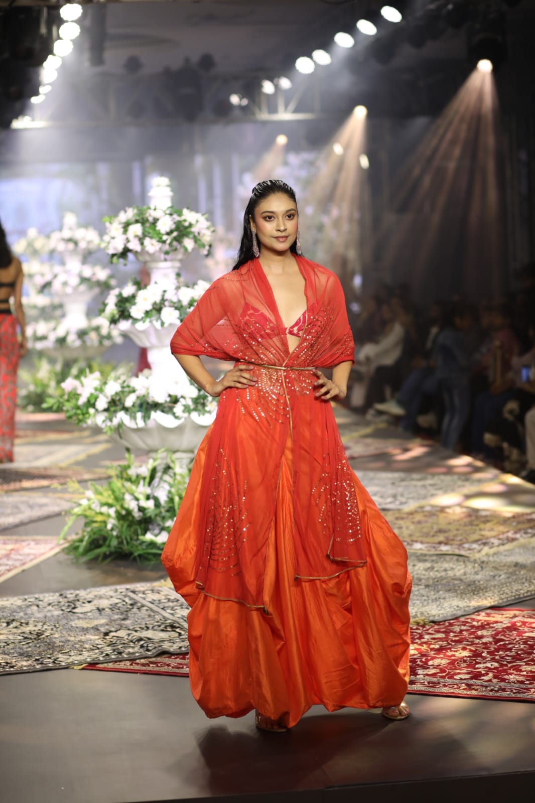 आज की शाम की विशेष प्रस्तुति में डिज़ाइनर वैशाली कुमार ने अपना नया संग्रह “Indo Fusion” पेश किया, जो भारतीय परंपरा और पश्चिमी आधुनिकता का आकर्षक संगम था। इस कलेक्शन में साड़ियों, सिल्क और जॉर्जेट जैसे भारतीय फैब्रिक्स को आधुनिक कट्स, ड्रेप्स और सिल्हूट के साथ जोड़ा गया। उनका यह संग्रह इस विचार पर आधारित है कि फैशन सीमाओं से परे हैं जहाँ भारतीय कारीगरी की आत्मा, वैश्विक स्टाइल की आत्मविश्वास भरी झलक के साथ एक हो जाती है।