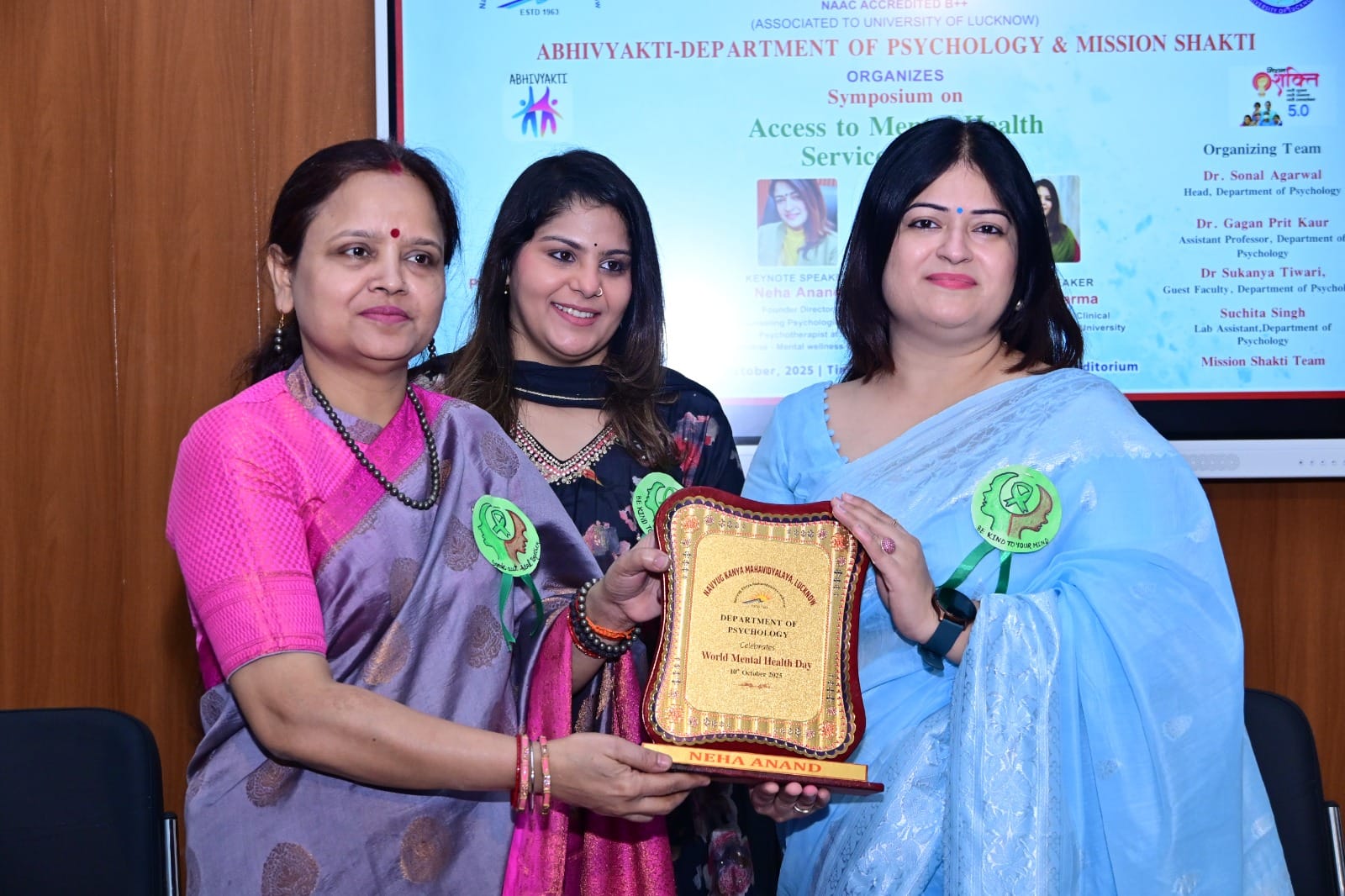 जिसका विषय था ‘ मानसिक चिकित्सा तक सबकी पहुंच ‘ इस महत्वपूर्ण कार्यक्रम का उद्देश्य मानसिक तनाव से अवगत कराना था और इसके प्रति लोगों को जागरूक करना था । कार्यक्रम का शुभारंभ दीप प्रज्वलन और सरस्वती वंदना के साथ किया गया। अतिथियों का स्वागत पौधे एवं स्मृति चिन्ह देकर किया गया । संगोष्ठी में मुख्य वक्ता के रूप में श्रीमती नेहा आनंद, संस्थापक निदेशक ,बोधि ट्री-मेंटल वेलनेस क्लिनिक एवं विशिष्ट वक्ता के रूप में मिस नंदिनी शर्मा, असिस्टेंट प्रोफेसर एमिटी यूनिवर्सिटी मनोविज्ञान विभाग उपस्थित रहीं। कार्यक्रम की अध्यक्षता महाविद्यालय की प्राचार्या प्रो मंजुला उपाध्याय ने की। नंदिनी जी ने कहा कि रोजमर्रा के जीवन में हम लोग जो नकारात्मक भावनाएं महसूस करते हैं उनके लिए तीन प्रकार के नियम हैं 1-आपको खुश रखने वाली गतिविधि,2 -अपनी दिनचर्या नियमित रखना 3 -अपनी नींद को पूरा करना। और इन नियमों के बाद भी अगर आप में नकारात्मक भावनाएं हैं तो आप मनोचिकित्सक से परामर्श कर सकते हैं। किसी भी स्ट्रेस की स्थिति में उसे कम करने के लिए आपको यह लाइन याद रखनी चाहिए “Smell the rose and blow out the balloon”