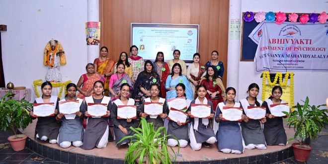 - बात करना बहुत आवश्यक है । अपने मनोभावों को समझना और उन्हें सही प्रकार व्यक्त करना चाहिए। कार्यक्रम का कुशल संचालन डा. सोनल अग्रवाल ने किया। कार्यक्रम की सफल संपन्नता मनोविज्ञान विभाग की असिस्टेंट प्रोफेसर डाॅ. गगनप्रीत कौर, डाॅ. सुकन्या तिवारी एवं सुचिता सिंह तथा मिशन शक्ति टीम के सदस्य प्रोफेसर नीतू सिंह, प्रोफेसर सीमा पांडे, डॉ. मनीषा बड़ौनिया, श्रीमती विमला बिंद द्वारा की गयी। इस अवसर पर पोस्टर प्रतियोगिता और प्रश्नोत्तरी प्रतियोगिता में चयनित छात्राओं को प्रमाण पत्र दिये गये। इस कार्यक्रम में महाविद्यालय की समस्त प्रवक्ताएं और छात्राएं उपस्थित रहीं।